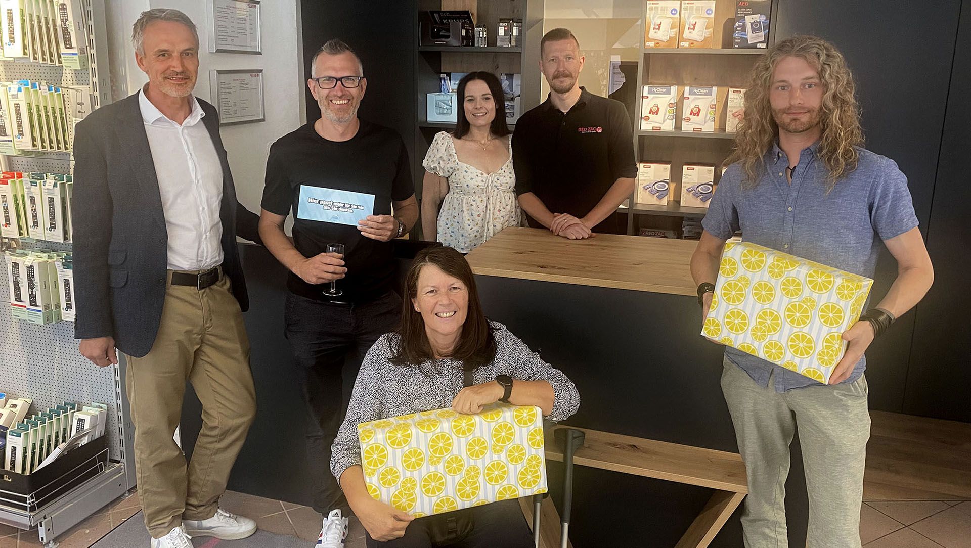 Red Zac-Chefin Maria Praxmarer zog die Gewinne und unser Geschäftsführer Gordon Köll stieß mit den TeilnehmerInnen im Elektrofachgeschäft an. Wir freuen uns, wenn sich die Bevölkerung für unsere Leistungen und Produkte interessiert. Zudem profitieren jetzt wichtige Infrastrukturbetriebe durch die Energiegemeinschaft mit der Marktgemeinde und dem Telfer Bad von der eigenen Stromproduktion.