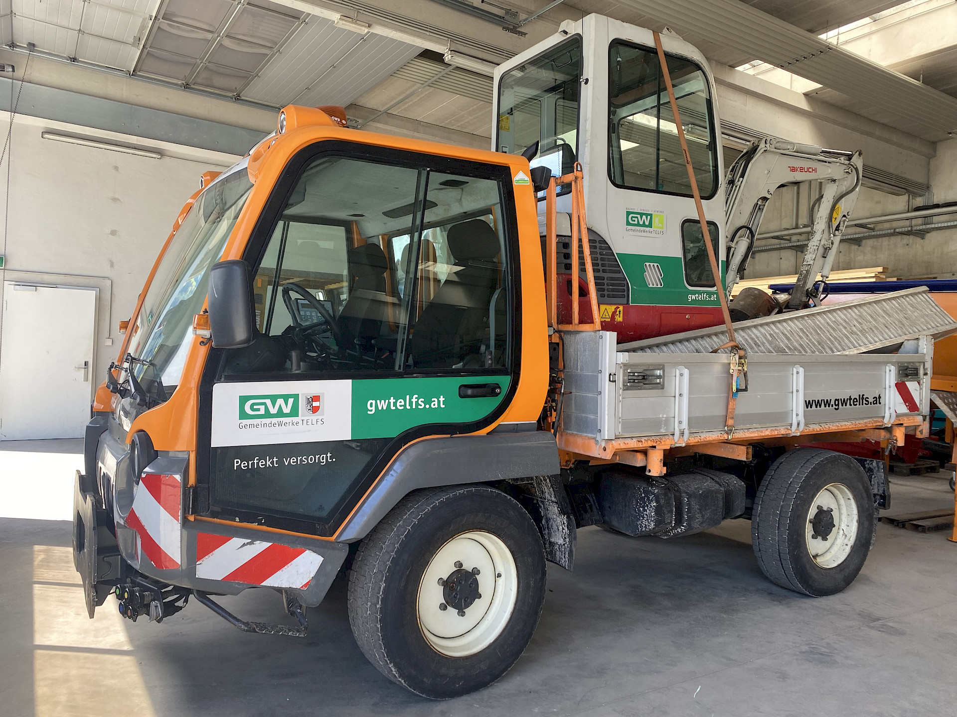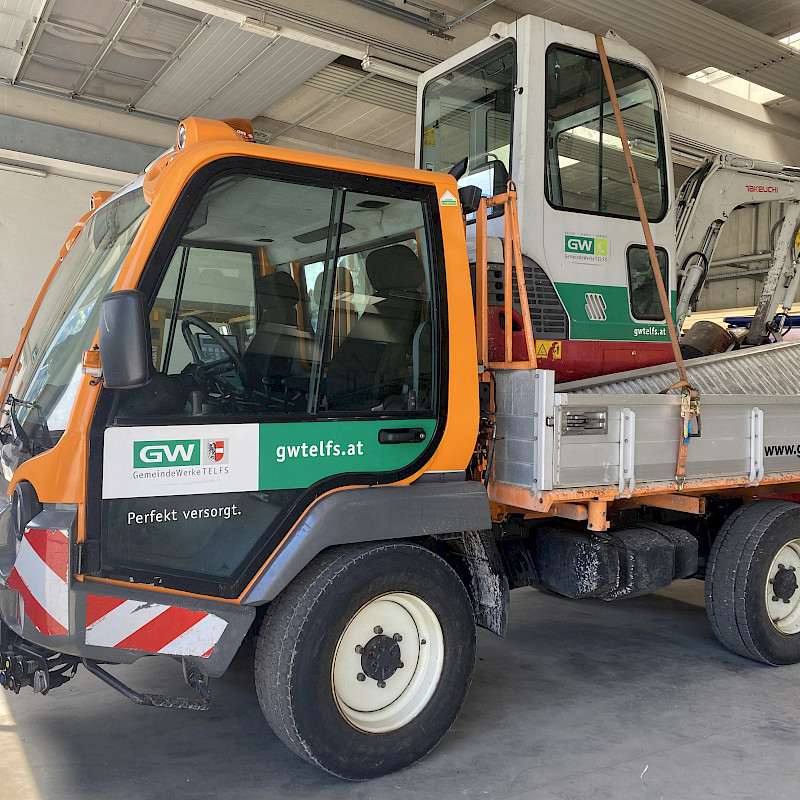 Der Fuhrpark der GemeindeWerke umfasste eine Reihe von schweren Geräten: Lkw mit Hiab, Bagger, Fassadensteiger, Unimog, Großtraktor mit Anhänger, Stapler usw. Damit können unsere Mitarbeiter u.a. Grabungsarbeiten durchführen, die Straßenbeleuchtung betreuen, Christbäume holen und aufstellen sowie diverse Transporte – oft kurzfristig – abwickeln. Neben der Marktgemeinde Telfs zählen auch Private und Firmen zu den Auftraggebern.